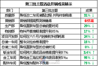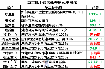 6)从各车间选定3条样板线效率改善,其中总装一、总装二全部达标,配件车间库存下降50%;